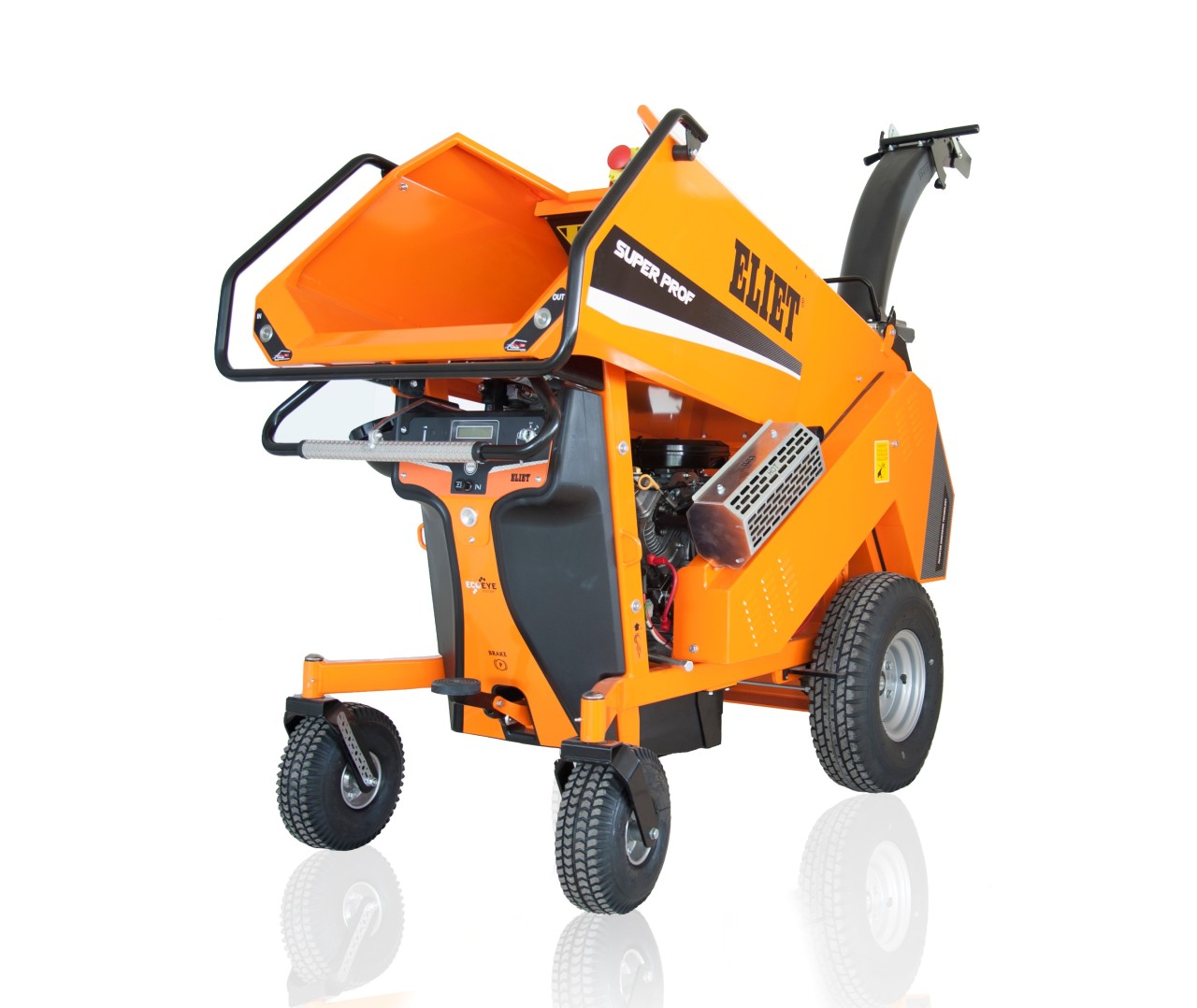 Der Eliet Super Prof Max ist mit seinen hydraulischen Einzugswalzen und dem breiten Einzugsschacht ideal geeignet für strauchiges Material. Das gehäckselte Material wird wird über eine Auswurfpfeife abgeworfen.